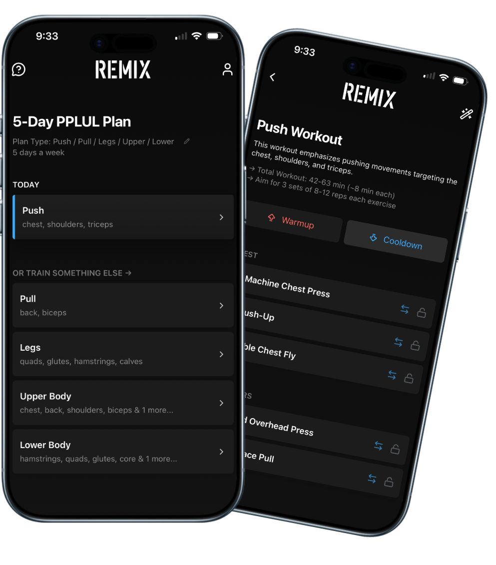 When you need it, Remix automatically adjusts your workout: balancing movement patterns, muscle groups, and fatigue.